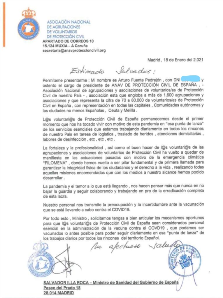 En el día de ayer nuestro Presidente, D. Arturo Fuente Pedrejón ha remitido una carta al Ministro de Sanidad D. Salvador Illa Roca instando le a que tenga a bien articular los mecanismos oportunos para que los voluntarios y voluntarias de las entidades de Protección Civil de España sean considerados personal esencial en la administración de la Vacuna contra el COVID 19, para poder seguir diariamente en “la punta de Lanza” de los trabajos diarios por todos los rincones del Territorio Español.